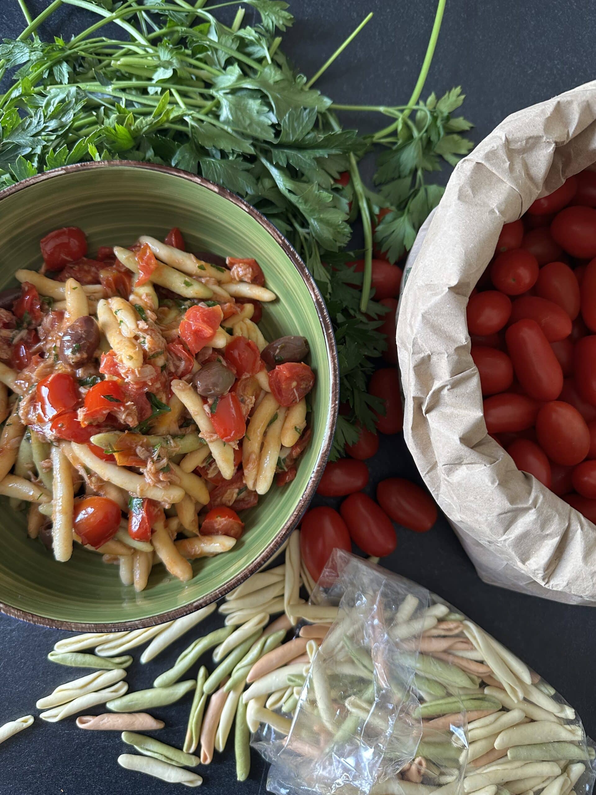 Per preparare questa ricetta non servono moltissimi ingredienti: pomodorini freschi dell’orto, olive taggiasche e una scatoletta di tonno. Il gioco è fatto! Per la pasta ho usato questi interessantissimi fricelli che, devo dire, non si sono rivelati affatto male. Però possiamo usare davvero qualsiasi formato di pasta ci piaccia.