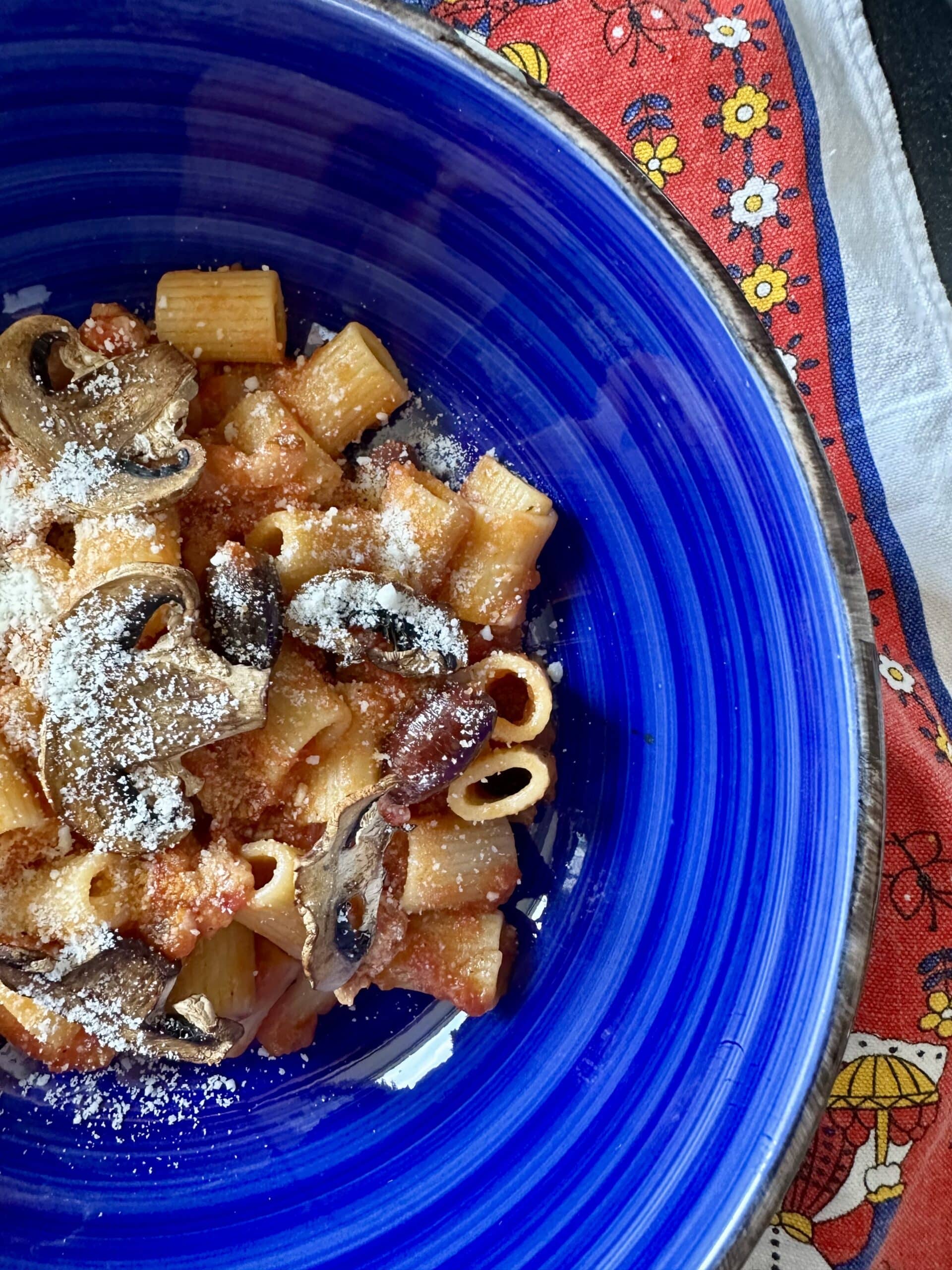 La vedo prendere e buttare in padella tutto ciò che ha a disposizione: guanciale, salsiccia, pomodoro, olive, funghi… ed ecco un piatto che riempie, scalda e fa felici.
